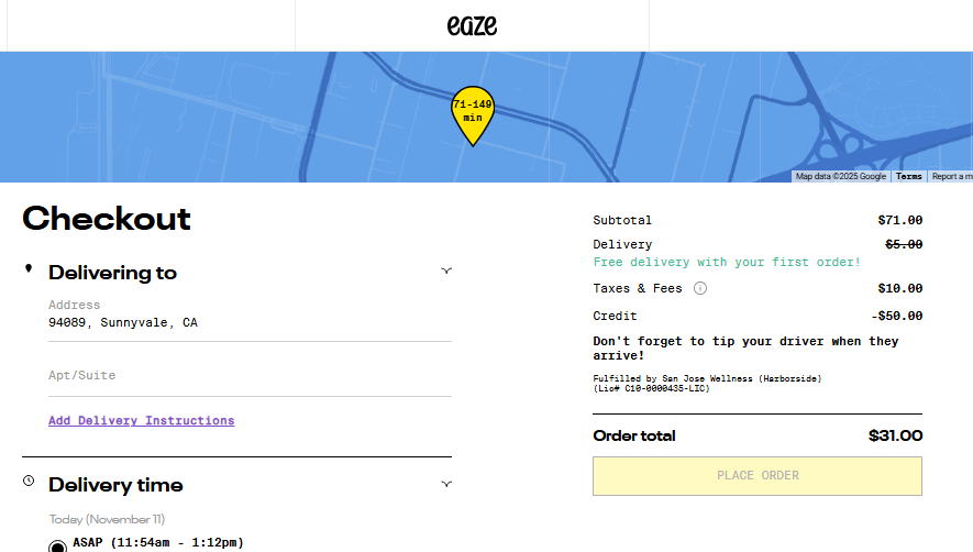 Log in to your Eaze account and enter your delivery address to see your local menu