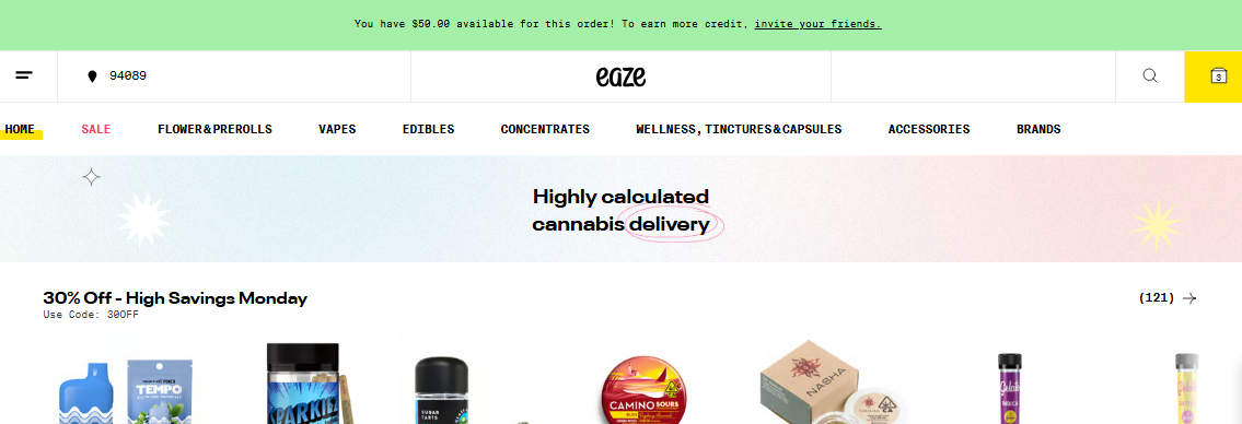 Once you have credits on your Eaze account, a green banner will display at the top of the website showing the available amount. The credits will be automatically applied to your next order.